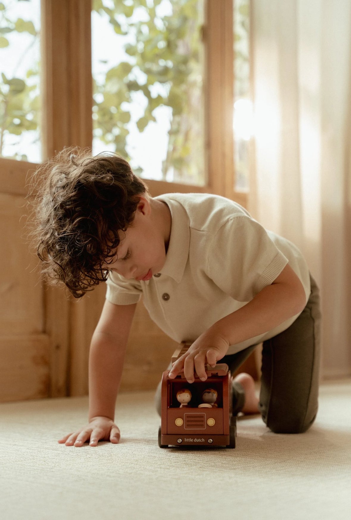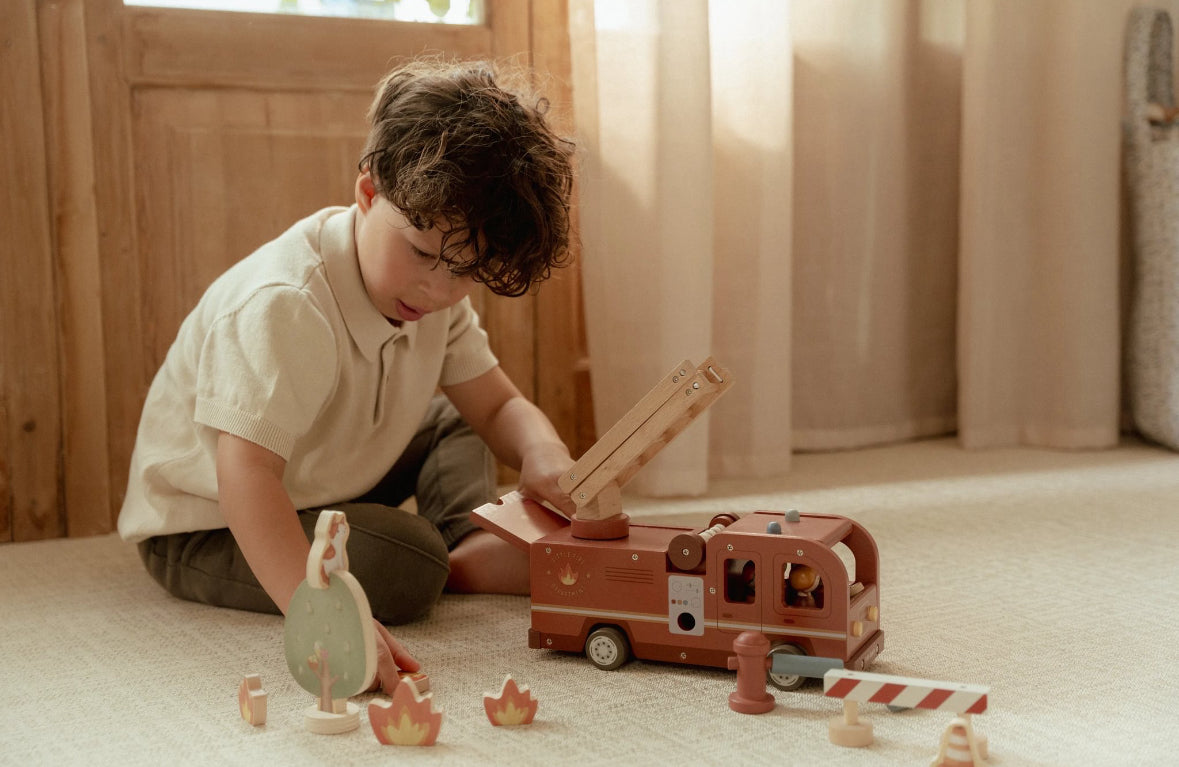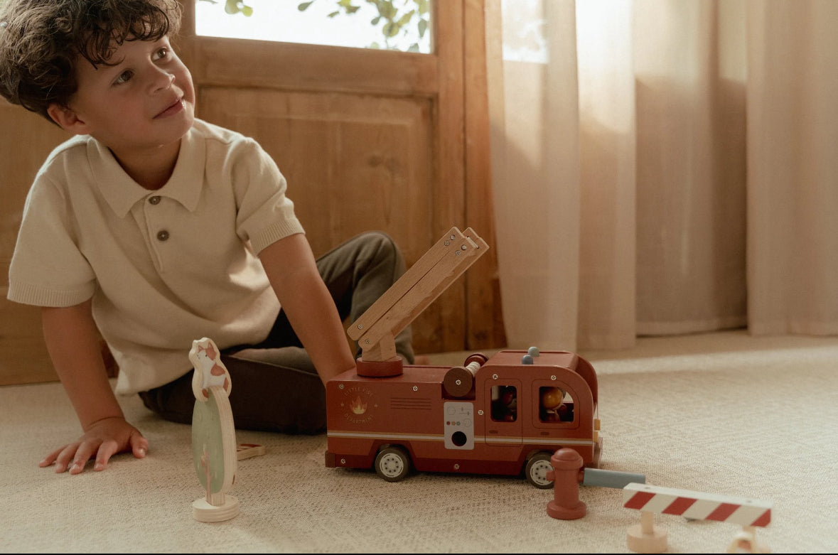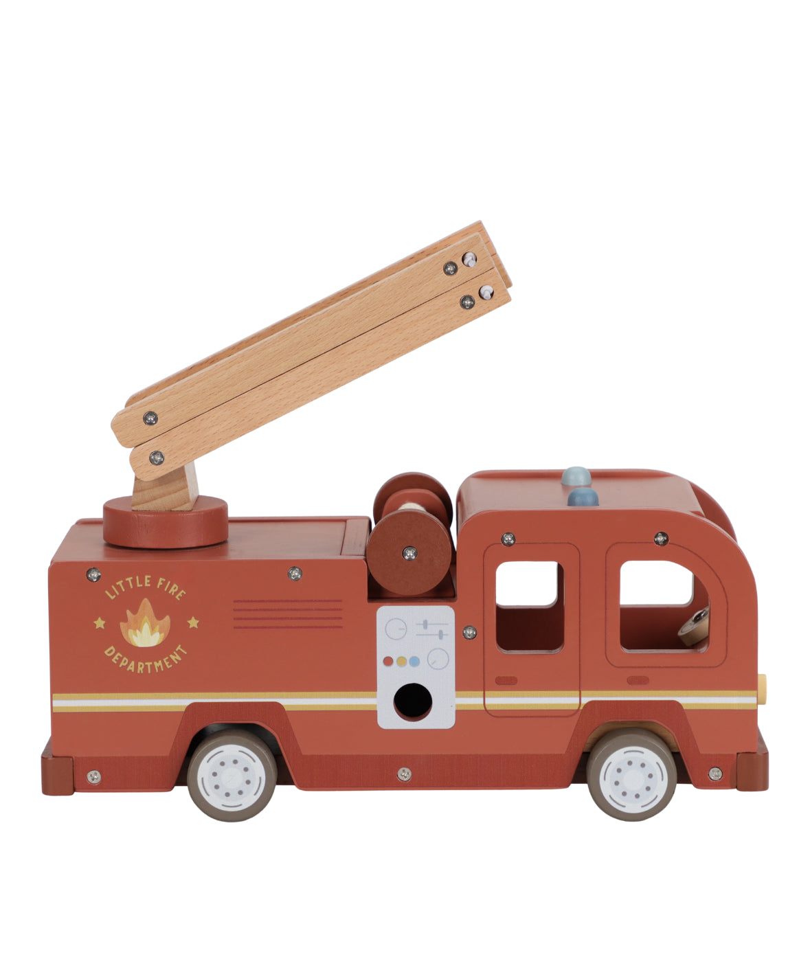 Rescue the cat from the tree! This wooden fire truck has an extendable ladder and a detachable hose that you can connect to the hydrant or the fire truck. Includes four firefighters, flames, and a hydrant. Perfect to combine with the fire station for even more play fun!