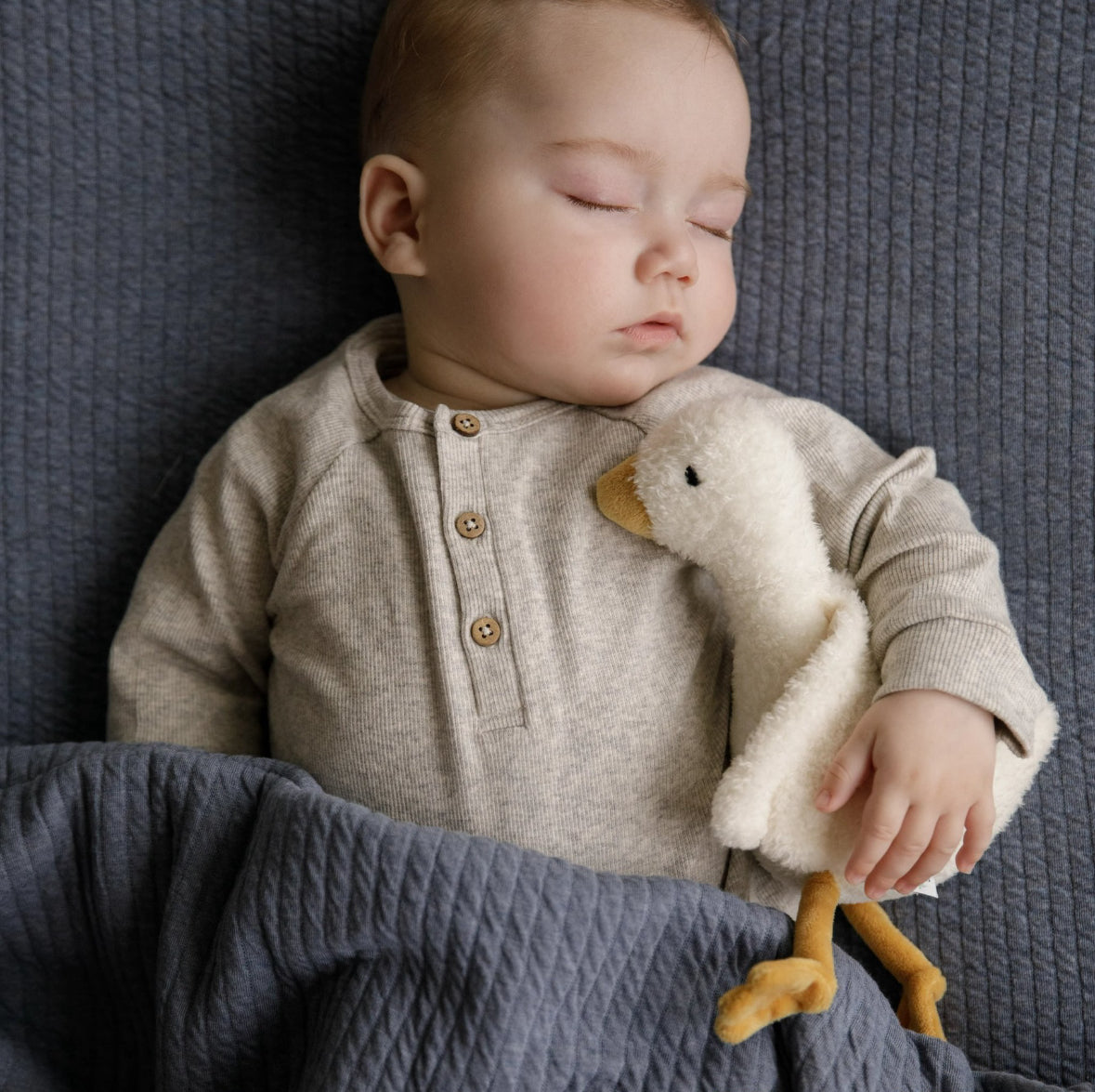Little Goose is approximately 20 cm high and made of incredibly soft plush. He can sit upright and looks great in any nursery. But he would rather be with you all day; to play, to cuddle and to sleep with you.